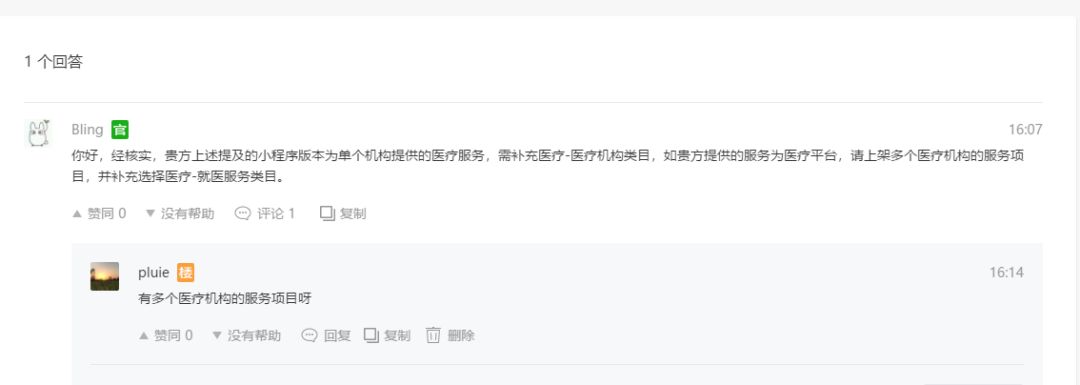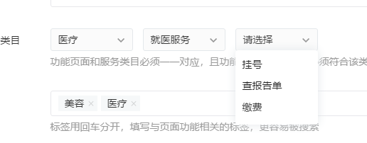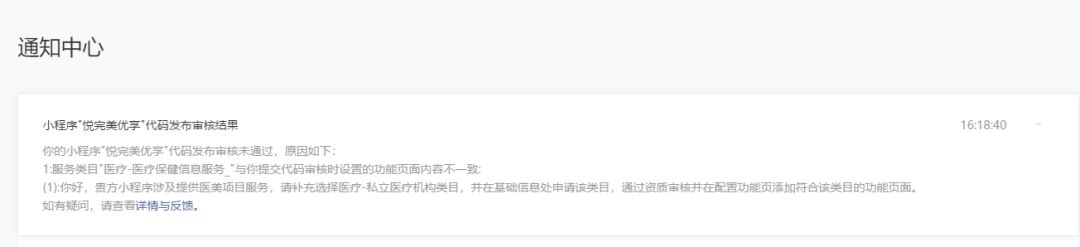 你好,经核实,贵方小程序最新提审版本涉及多家医疗机构提供医美服务,可在原有类目基础上补充选择医疗-就医服务-挂号类目,请在类目通过资质审核后,并在配置功能页添加符合医疗-就医服务的功能页面。