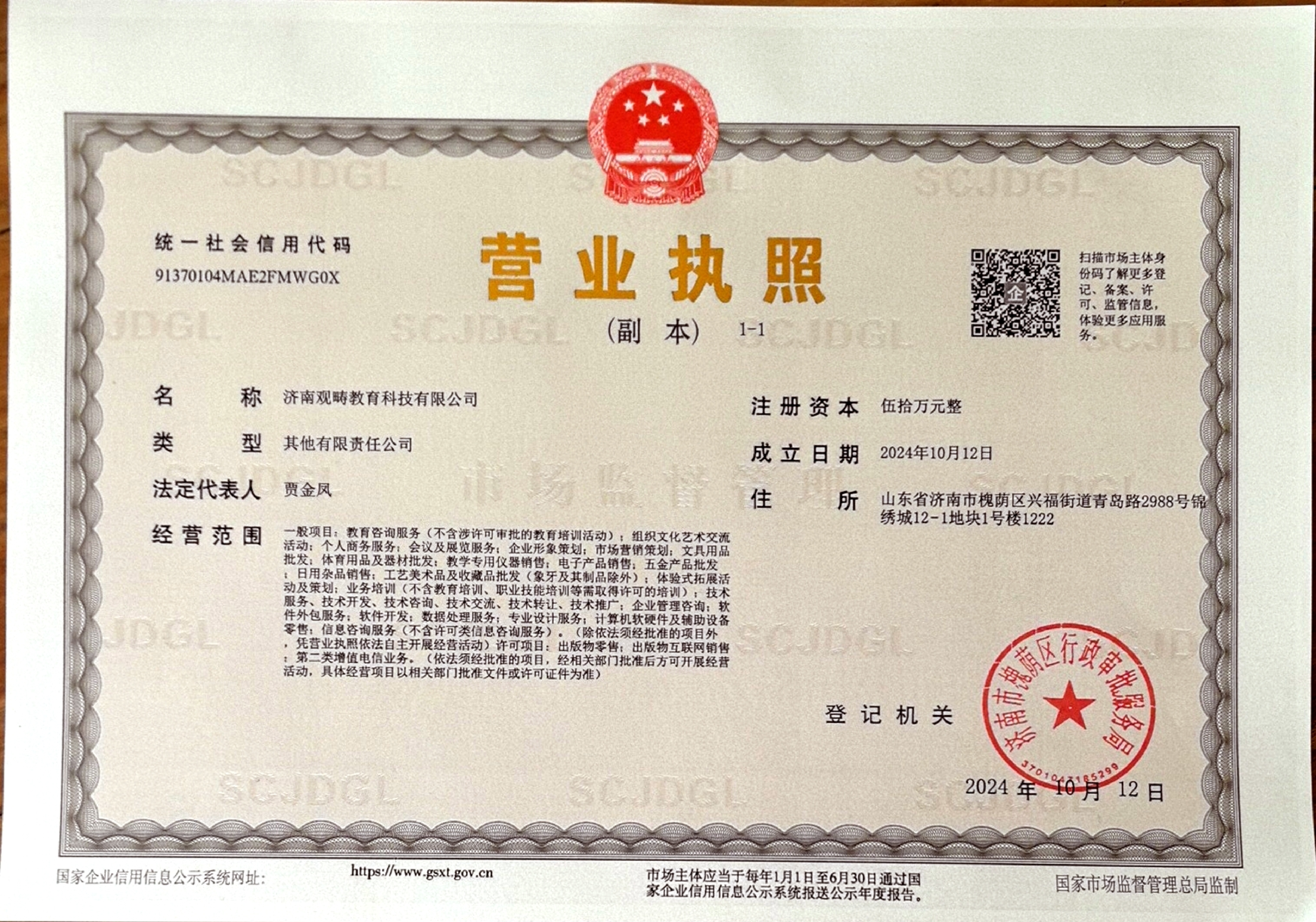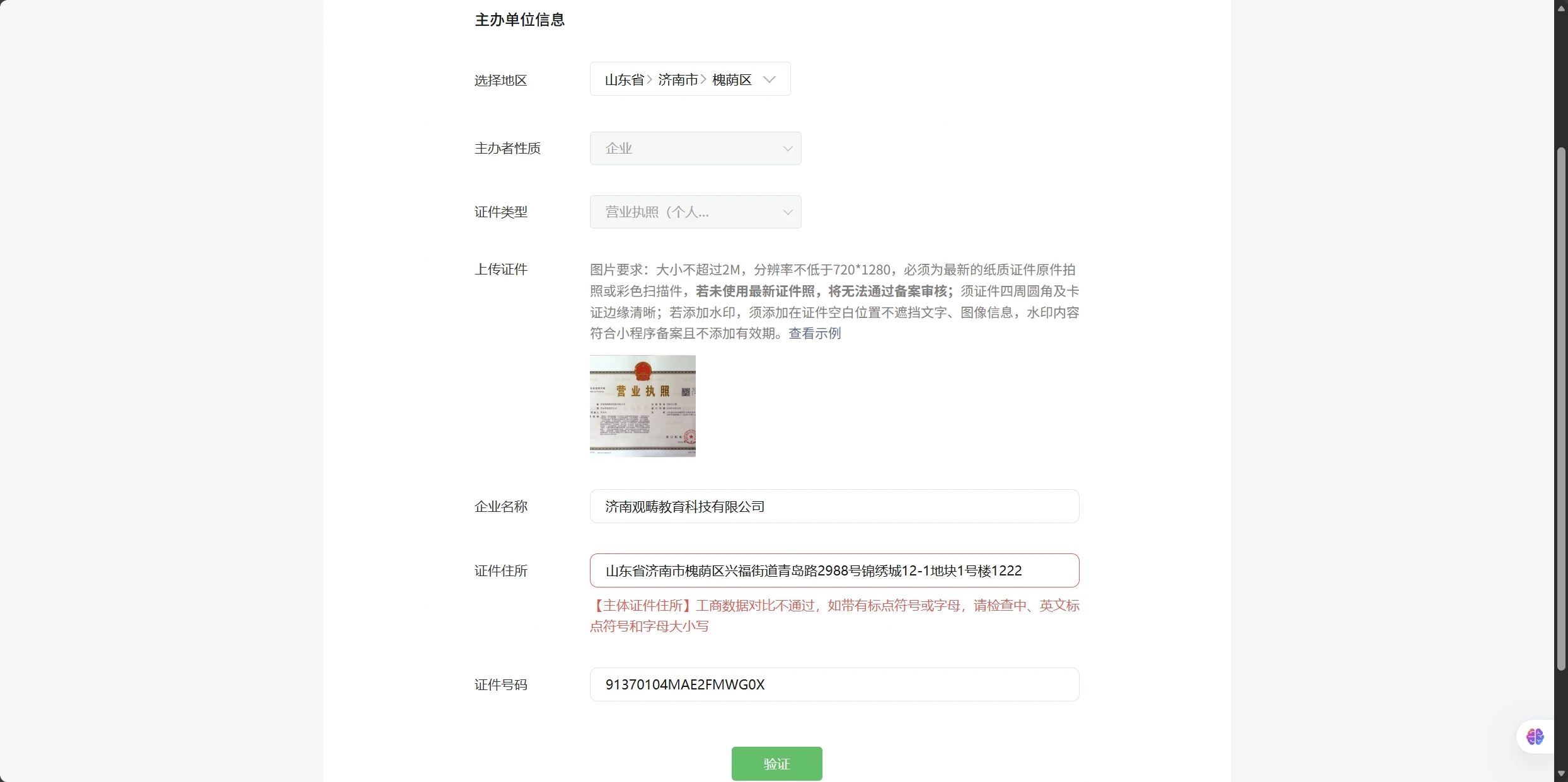 你好,根据国家企业信用信息公示系统中显示当前主体近期有变更过主体地址,麻烦请提供最新的营业执照进行备案。