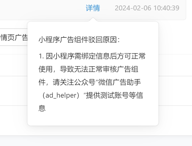 因小程序需绑定信息后方可正常使用,导致无法正常审核广告组件,请关注公众号“微信广告助手(ad_helper)”提供测试账号等信息