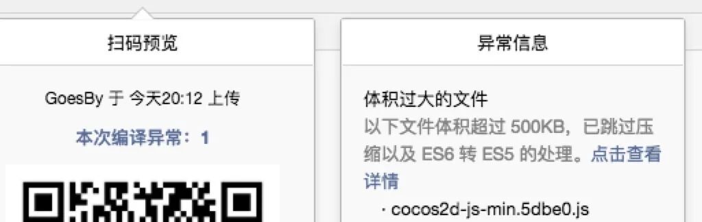 因此,开发者工具在处理 JS 文件时,如果 单个 JS 文件的体积超过了 500KB,则会跳过 ES6 转 ES5 以及代码压缩的处理,并在最后展示已跳过处理的 JS 文件列表。