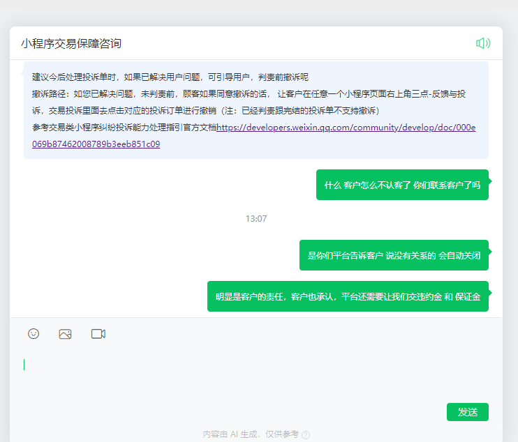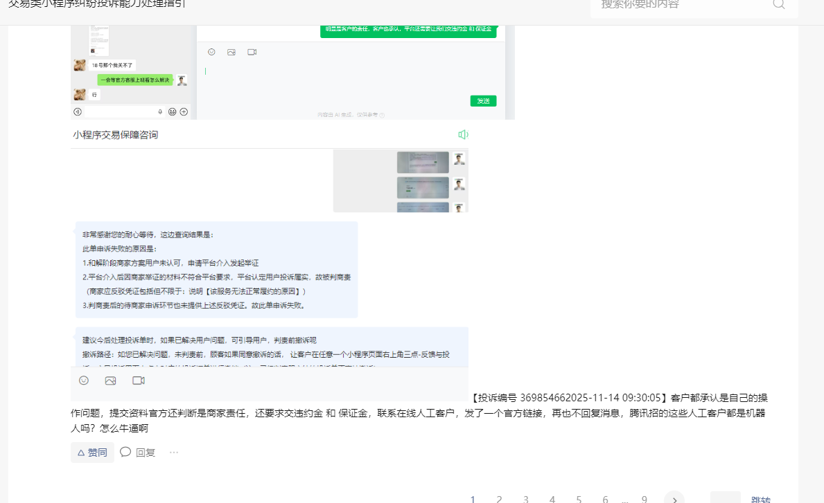 【投诉编号 369854662025-11-14 09:30:05】客户都承认是自己的操作问题,提交资料官方还判断是商家责任,还要求交违约金 和 保证金,联系在线人工客户,发了一个官方链接,再也不回复消息,腾讯招的这些人工客户都是机器人吗?怎么牛逼啊