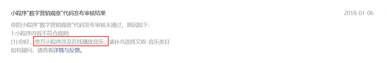 如图所示,提交的审核版本并没有添加任何音乐播放组件或功能,审核结果提示“贵方小程序涉及在线播放音乐”,是否为误审?