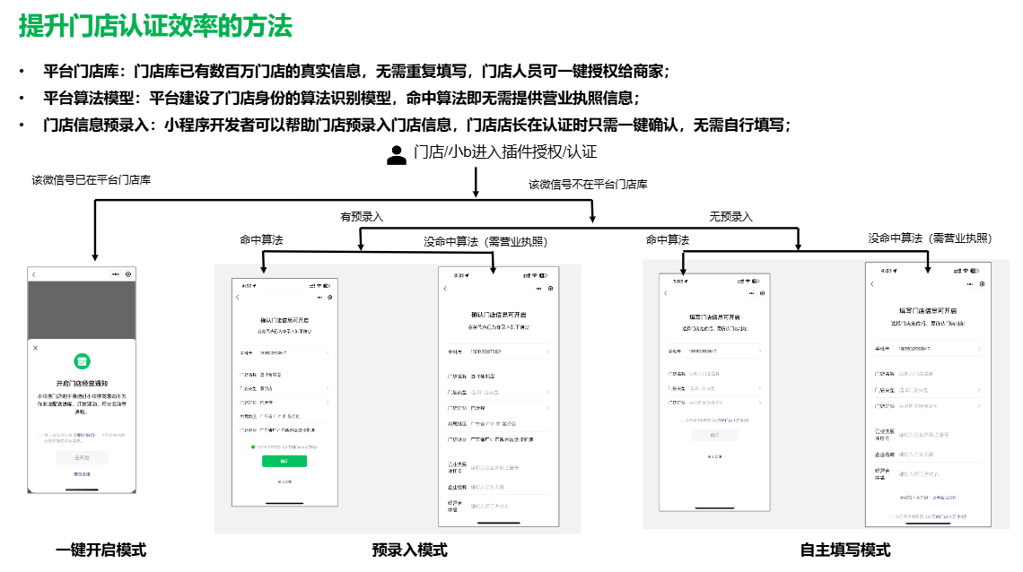 门店认证基于微信号,实际用户在做门店认证时是否需要上传营业执照是跟据平台算法来的,参考小程序B2b门店助手产品功能介绍:https://docs.qq.com/slide/DTERERU50RlFQV1Bm