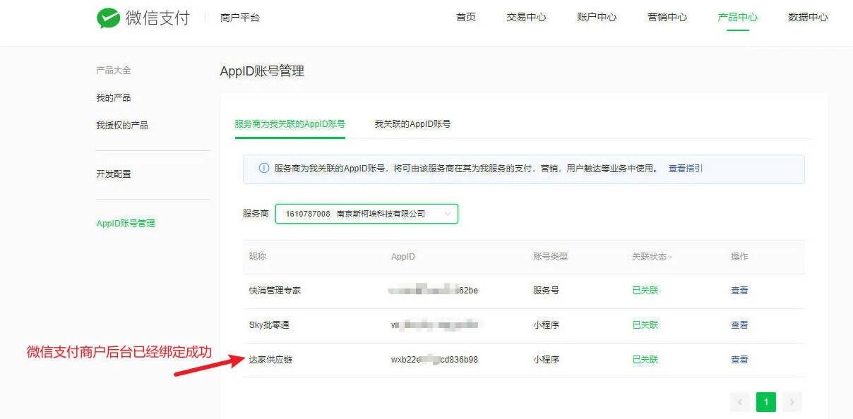 在服务商商后台合作伙伴功能已关联好该小程序,支付商户也绑定好