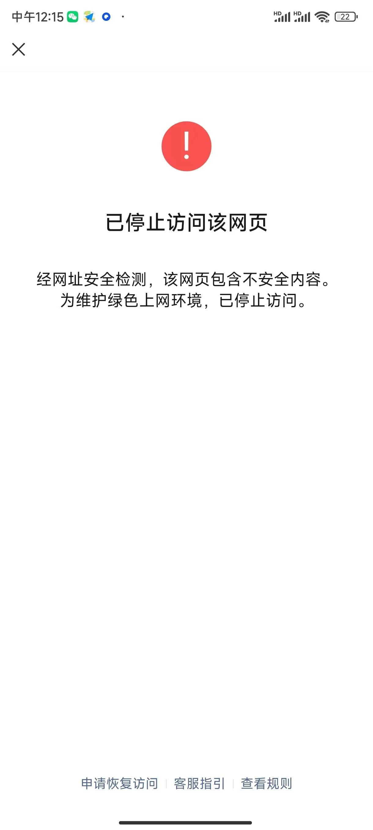 你好,请提供点击链接时出现拦截页的微信号、时间,以便我方核实。