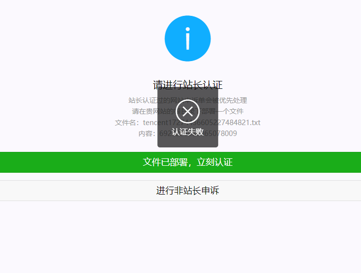 网站被拦截无法打开,按站长进行认证了,已经部署了相关文件,但是一直提示认证失败,网站备案号:湘ICP备2024094303号-1