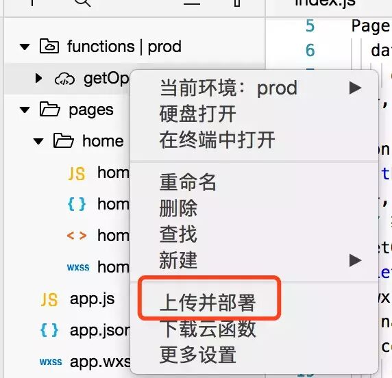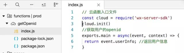 cloud.init()//获取用户的openidexports.main = async(event, context) => { return event.userInfo; //返回用户信息}6,右键点击getOpenid,上传并部署云函数。
