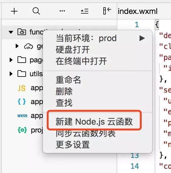 3,右键点击functions,点击新建node.js云函数
