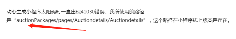 动态生成小程序太阳码时一直出现41030错误。我所使用的路径是“auctionPackages/pages/Auctiondetails/Auctiondetails”,这个路径在小程序线上版本是存在。