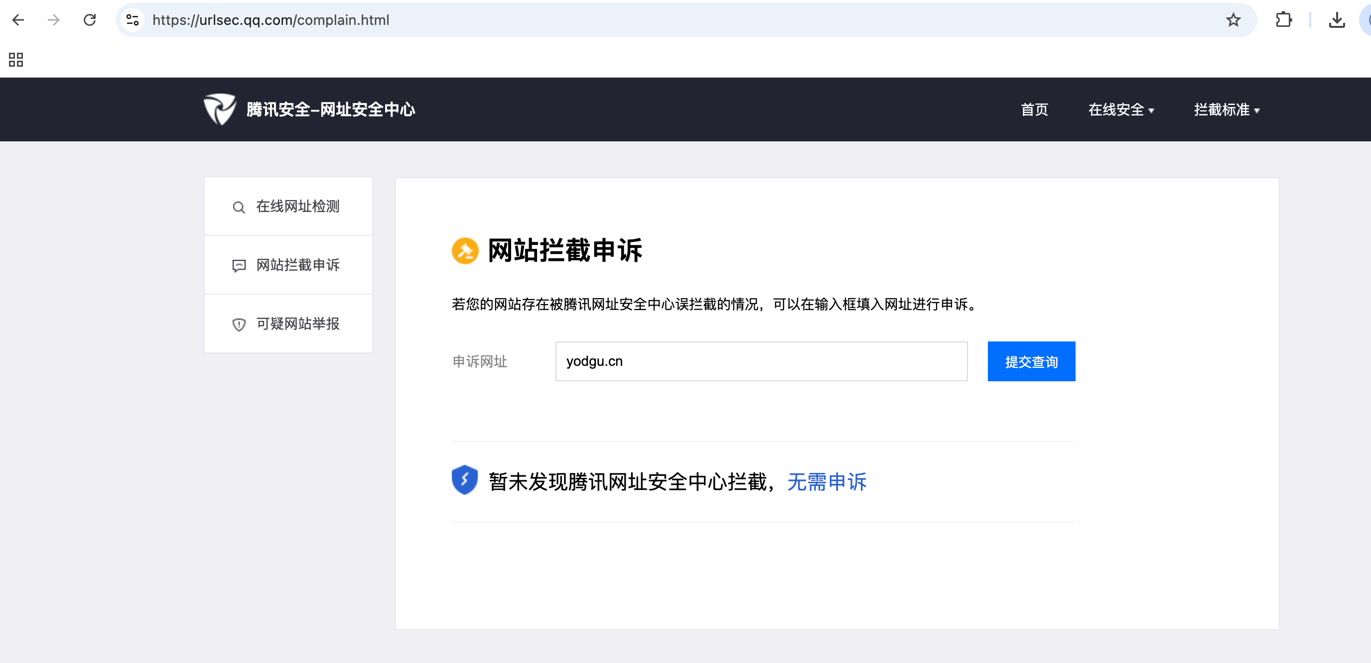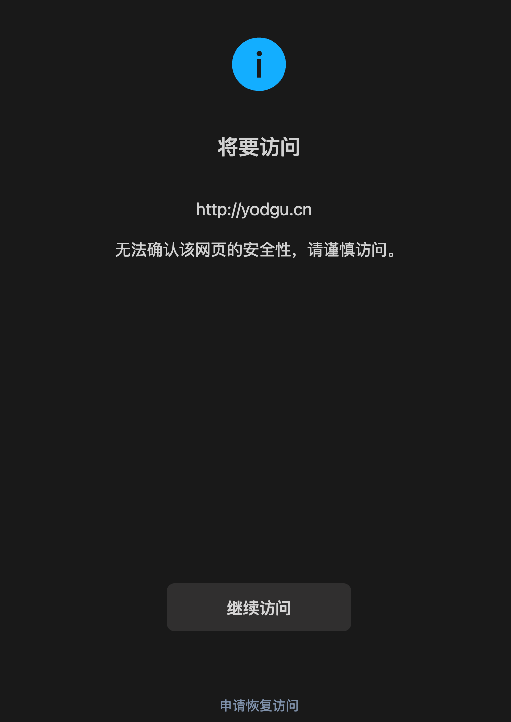 https://yodgu.cn,域名并未违规,但是在微信内访问被拦截,无法直接访问,需要能恢复直接访问