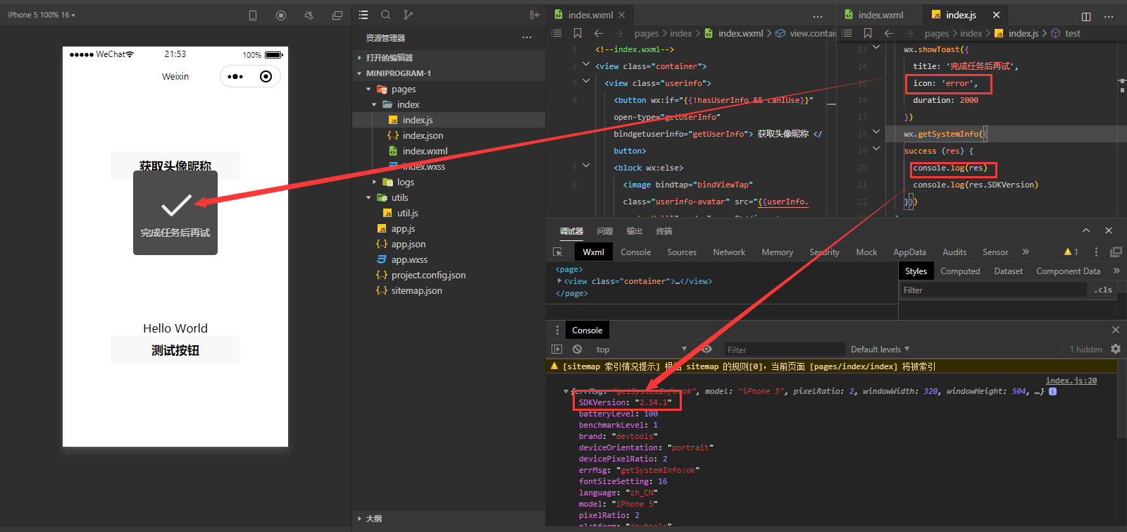 test:function(){ wx.showToast({ title: '完成任务后再试', icon: 'error', duration: 2000 }) wx.getSystemInfo({ success (res) { console.log(res) console.log(res.SDKVersion) }}) },