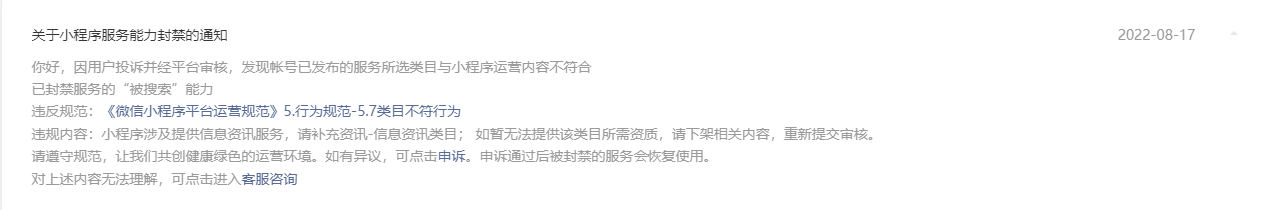 如题,此前因缺少资讯类目,小程序被封禁”被搜索“能力,提示说如果调整可以申诉解封,但是因为申诉次数用完了,现在没有了申诉入口