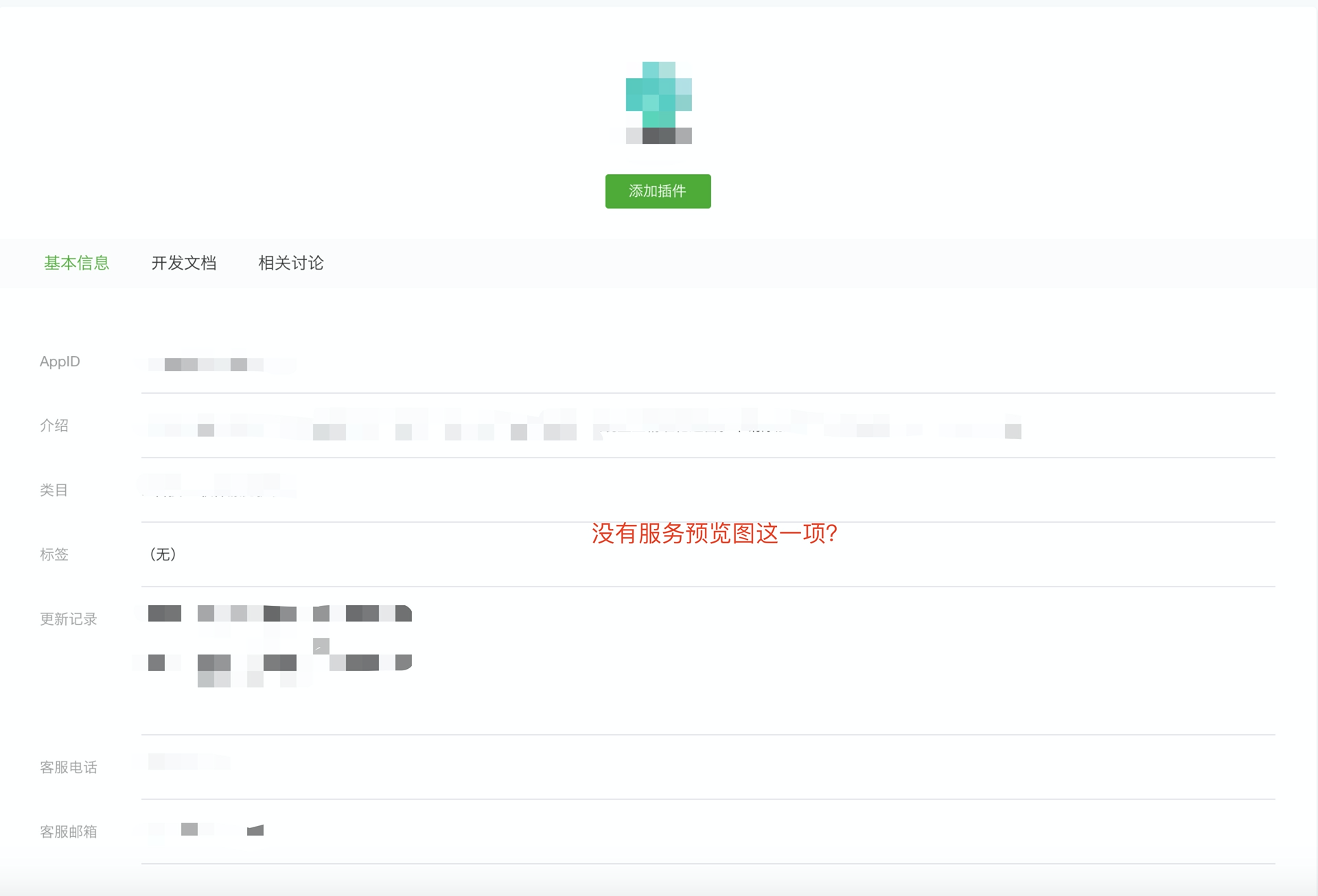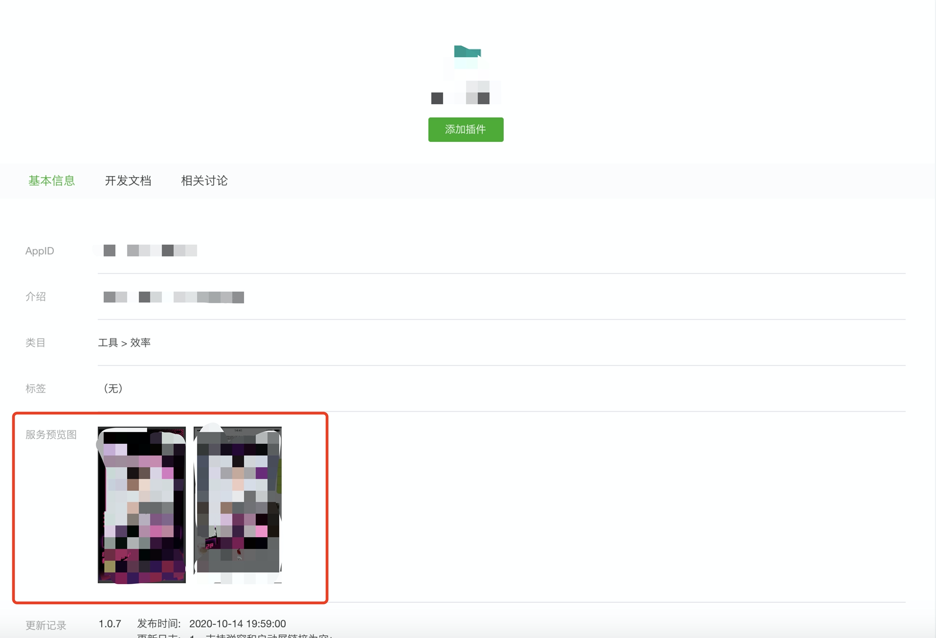 如图所示,在搜索添加“第三方插件”的时候,查看小程序插件的基本信息,有一个展示“服务预览图”的部分,有的小程序插件有,有的小程序插件没有。想知道这个“服务预览图”是在哪里设置的?