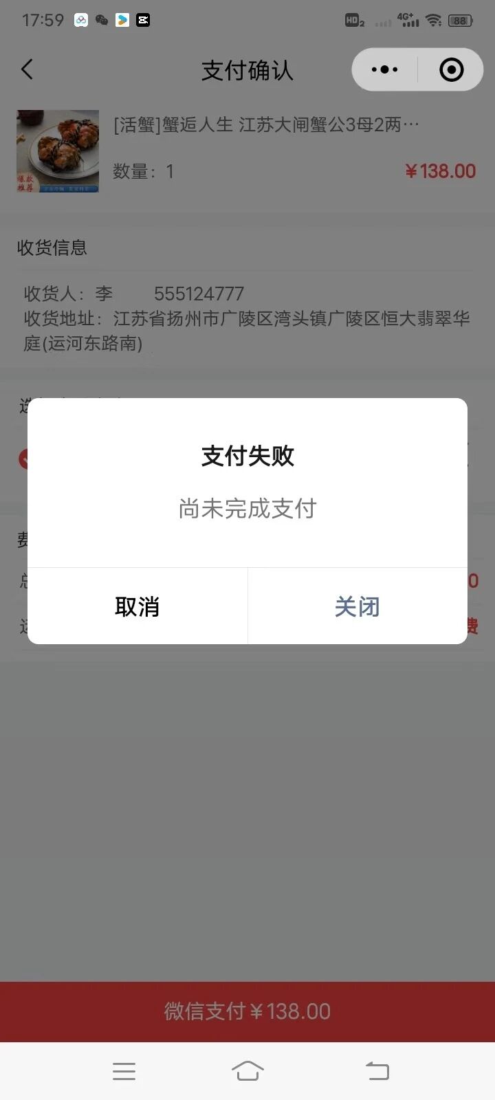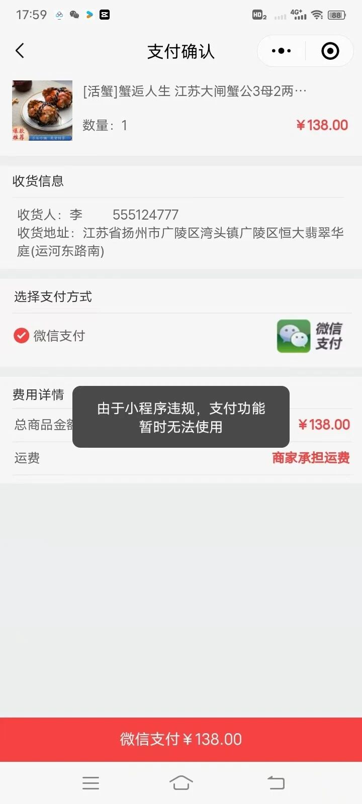我创建好了小程序,发不了,也绑定了商户号,秘钥,api证书。准备跑流程付一下款,却显示违规,无法付款,后台也没有违规记录,问了微信支付那边的客服不是那边的原因,请排查一下问题,这是小程序名称蟹逅人生,商户号1726776150
