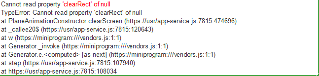 {"md":"HRY-AL00Ta","version":"7.0.17","cl":"Android 10","uhw":"692*360","os":"android","pageurl":"pages/webview/index?index=2&row=2&position=0.0166666667%252C0.2121212121%252C0.97%252C0.5696969697&type=1&url=https%253A%252F%252Fmyouxuan.hzxituan.com%252Fpromotion%252Fsubject%252Findex.html%253Fid%253D264&area=home_hot_spot","logdebugid":"_0.6184605945347246","namesacpe":"mini:app","data":["apperror","MiniProgramError\nCannot read property 'clearRect' of undefined\nTypeError: Cannot read property 'clearRect' of undefined\n at animate (https://usr/app-service.js:12975:2079)\n at https://lib/WASubContext.js:2:892926\n at Map.forEach ()\n at https://lib/WASubContext.js:2:892882\n at Function. (https://lib/WASubContext.js:2:892528)\n at \n at https://lib/WASubContext.js:2:111972\n at Function. (https://lib/WASubContext.js:2:94582)\n at https://lib/WASubContext.js:2:100802"],"mid":3095942,"oid":"ou7a15IQ01WqK2wVWjgub5KE6hWg"}
