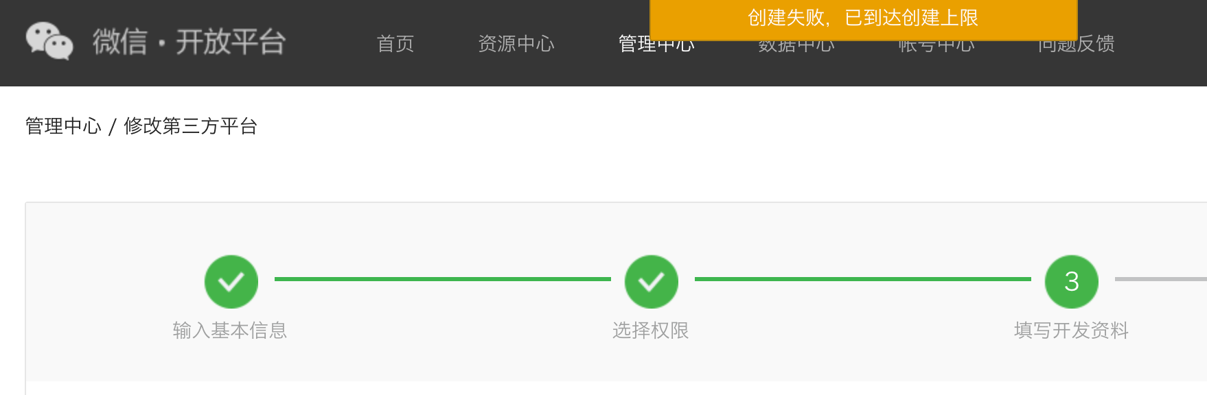 修改第三方平台资料,一直提示「平台创建失败已达上限」但是实际上只有一个