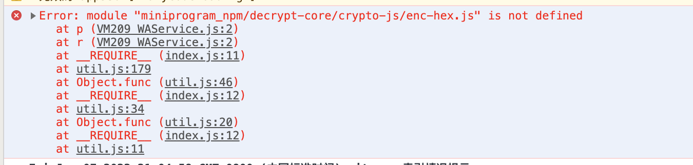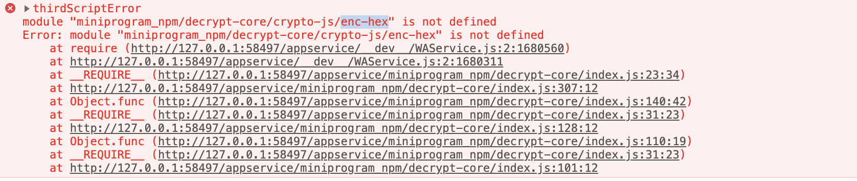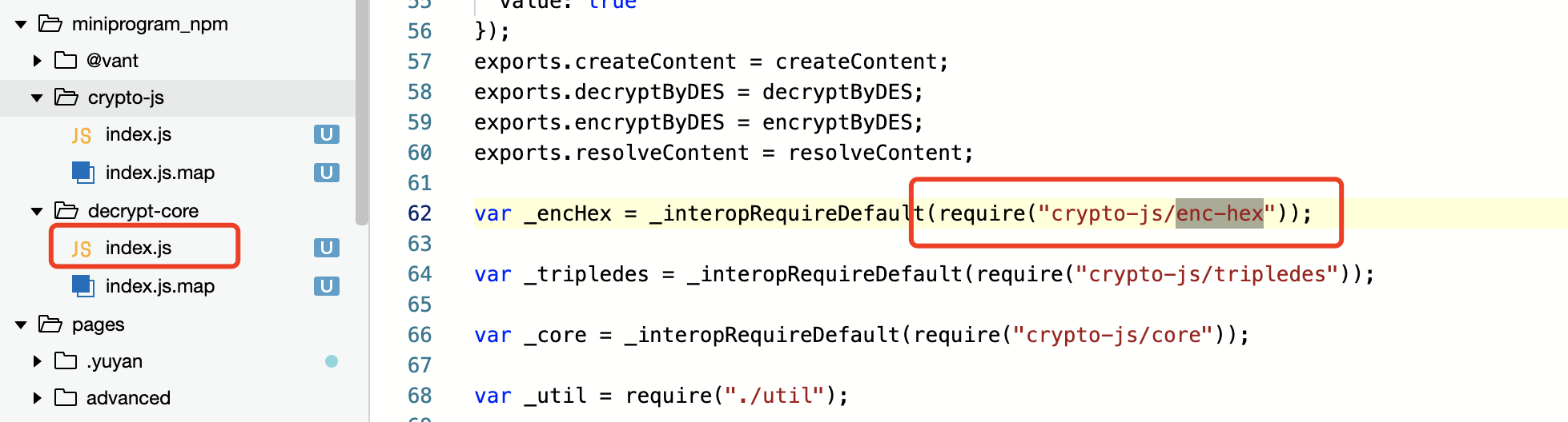 - decrypt-core 库被小程序开发工具构建 npm 之后 miniprogram_npm/decrypt-core/index.js 文件中有对第三方 npm 包的引用,见下图,报错也是说这个包找不到