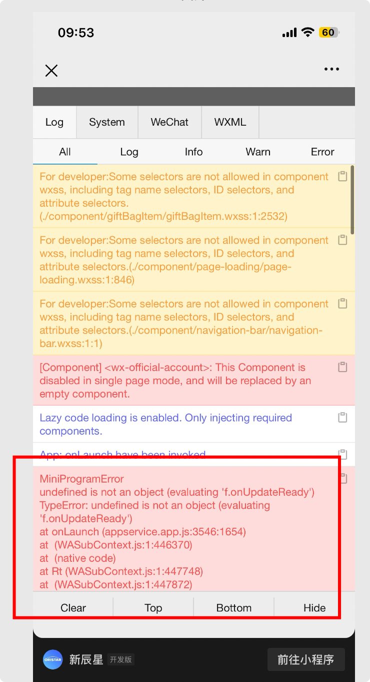 我们小程序加了分享朋友圈功能,在体验版里分享到朋友圈打开是空白的,看了下报错: