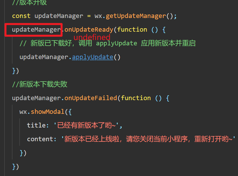 这个updateManager在朋友圈点击进入小程序的时候是undefined, 想知道这里有啥问题吗, 这块只是提示有没有新版版用的