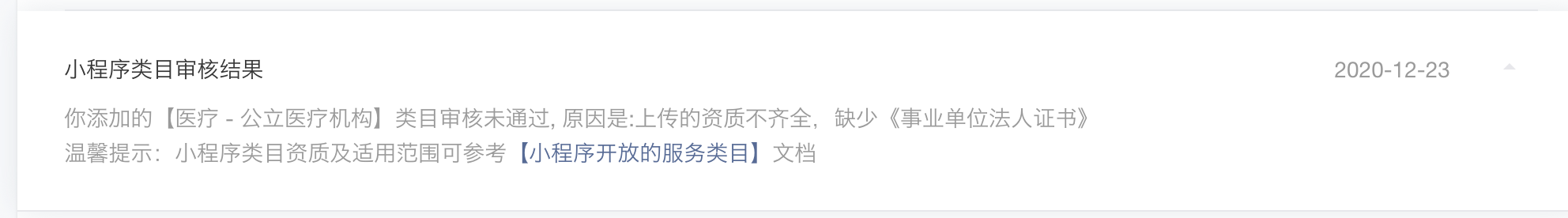 小程序 服务类目审核 选 公立医疗机构 需要《医疗机构执业许可证》与《事业单位法人证书》,但是我院属于部队医院,没有事业单位法人证书,而且国家已经取消了军队单位对外有偿服务收费许可证,请问该如何申请 公立医院 的 服务类目?已提交医疗机构执业许可证,但是审核不通过。