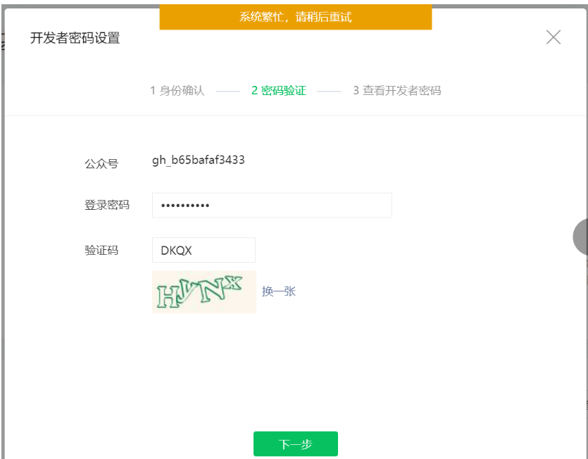 您好,启用微信开发者密码,需要调取公众号接口。显示系统繁忙,,很多天了一直这样,不知道是怎么回事,麻烦帮看下,十万火急,麻烦帮查看下,感谢!!!