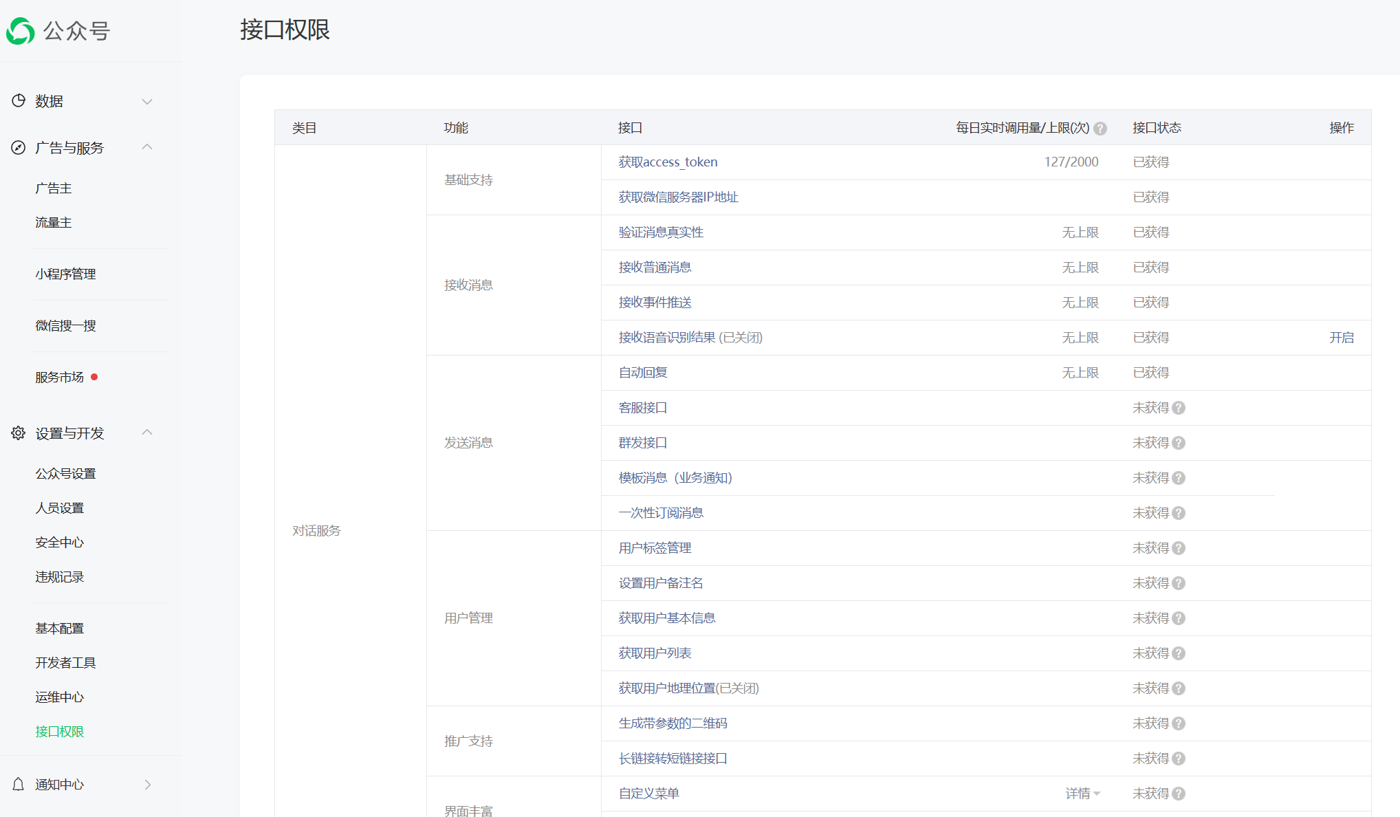 请问这个接口也有次数限制吗,如果有为什么不能在公众号看到,下面的位置根本没有这个接口的相关信息
