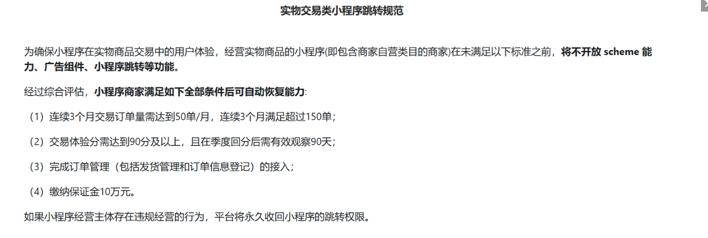 你好,核实到目前小程序暂无相关跳转功能限制。