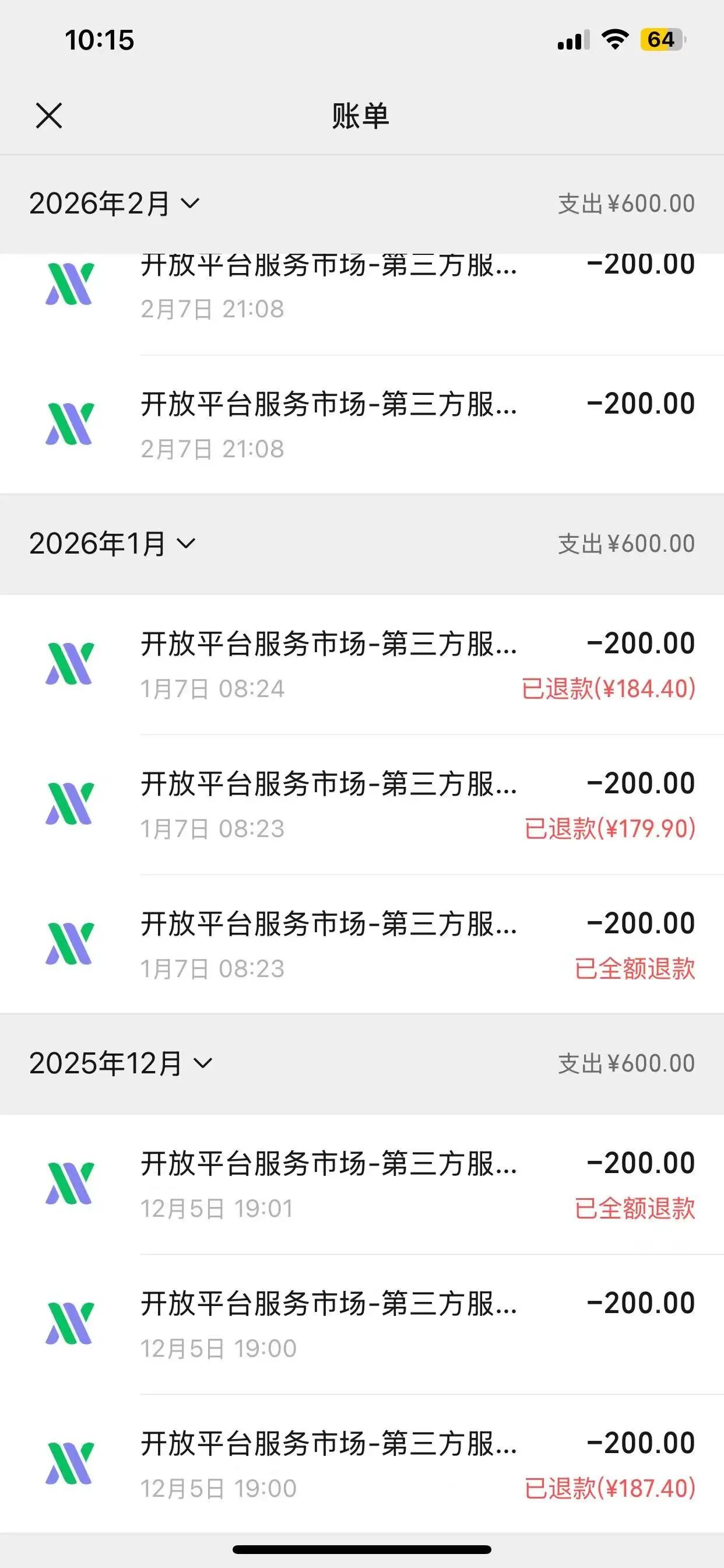 25年1月出现过后来还好年前就退款到账了,26年1月再次出现,到现在都没有退款,更过分的是,小程序后台显示已退款,但是绑定的微信没有退款记录,见图。