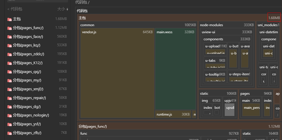 主包尽量不要超过1.5M,实际打包上传的大小跟这里分析显示的是不一样的