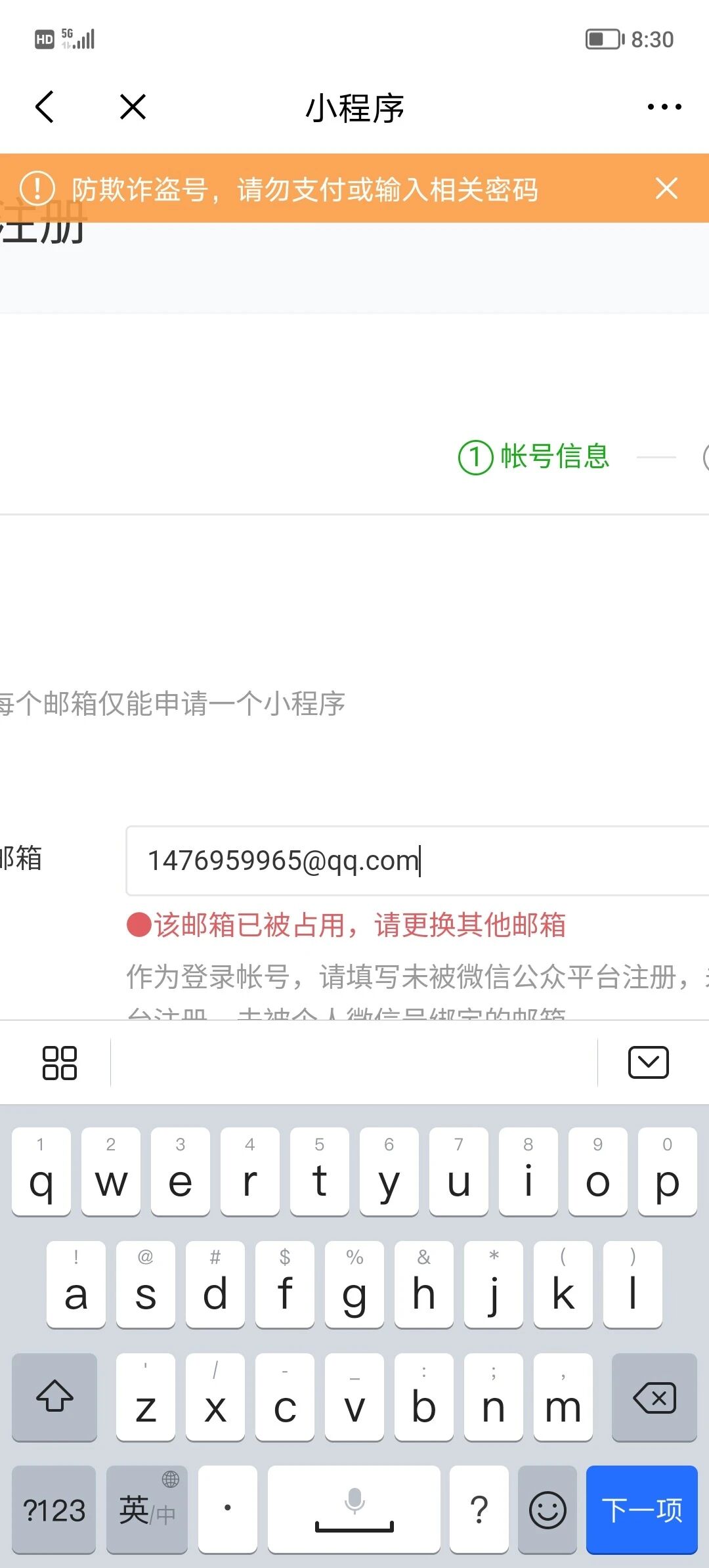 你的这个邮箱应该注册过小程序或者公众号,所以不能用换个邮箱试试
