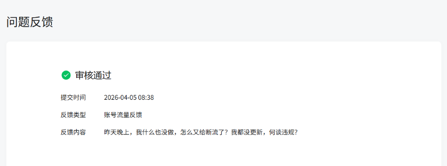 后面通过账号流量反馈+社区申诉,账号恢复正常。