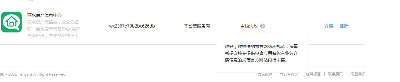 微信开放平台 第三方平台创建的平台型服务商审核失败,提示(你好,你提供的官方网站不规范,请重新提交补充提供包含应用名称有业务详情信息的规范官方网站再行申请.)请问下腾讯工作人员,这个官方网站哪里不规范,麻烦给标注下,我们好更改,谢谢!麻烦尽快回复下,加急!