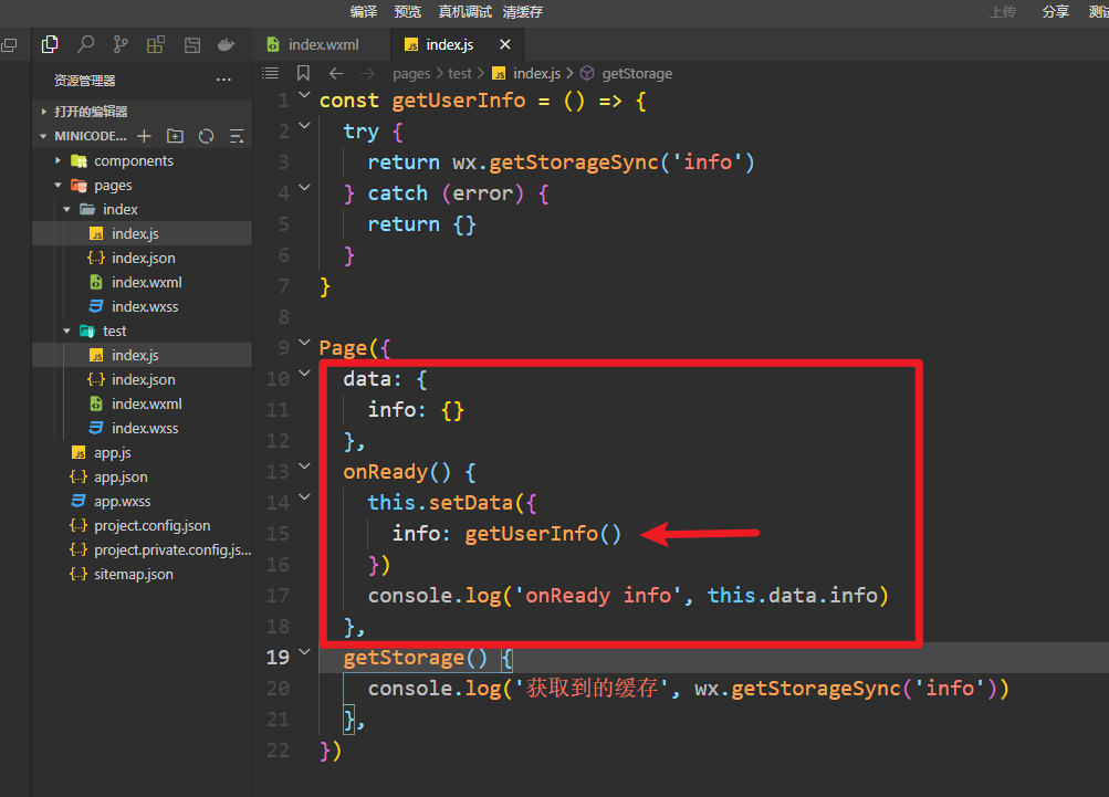 123 改成 onLoad() { this.setData({info: getUserInfo()})}