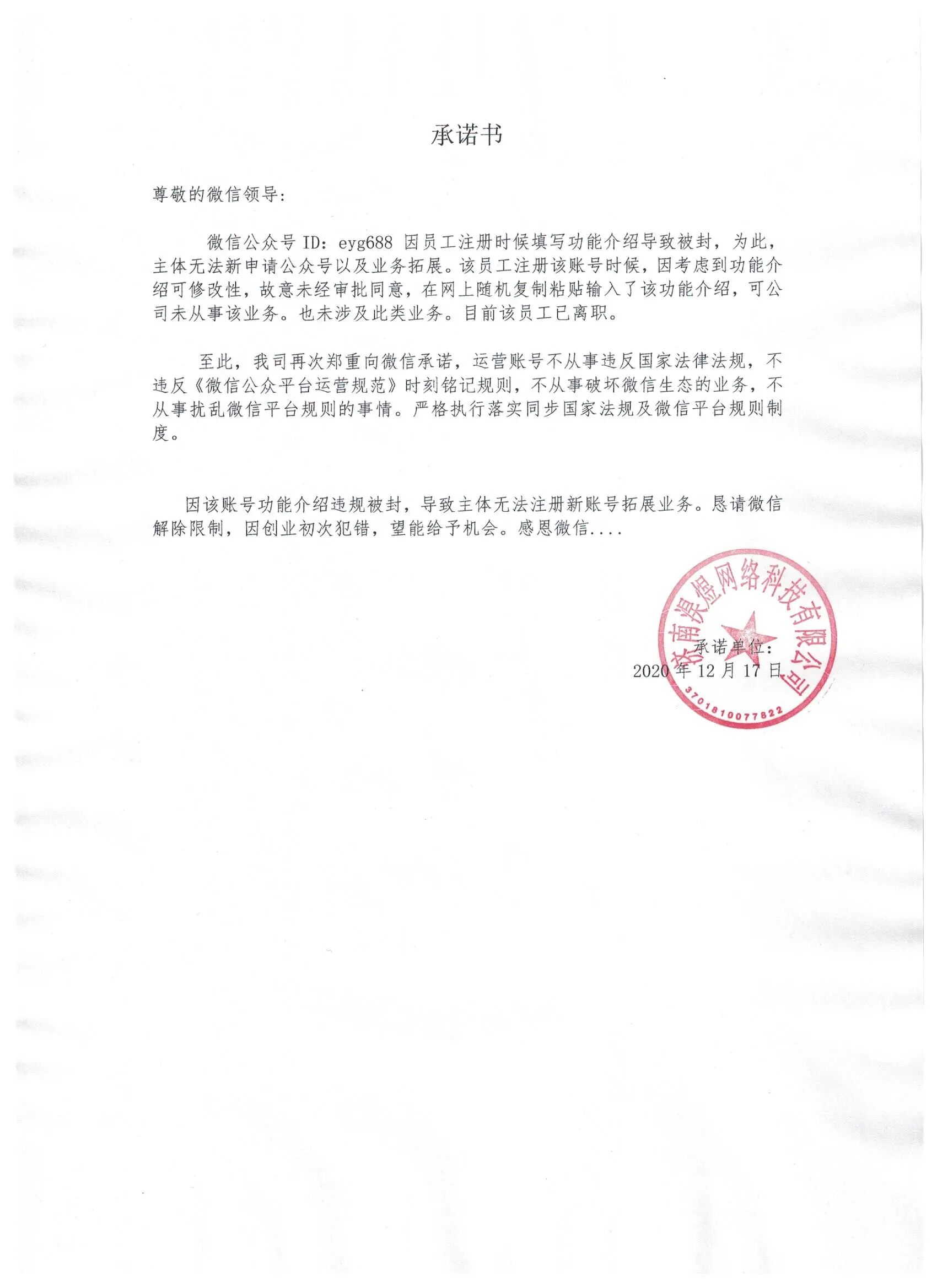 该账号功能介绍是员工注册在复制填的,内容未经审批,导致账户被封,主体被限制,业务进行困难,公司再次向微信承诺,绝不从事违反国家法规及《微信公众平台运营规范》的事情。公众号ID:eyg688