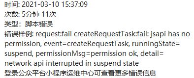 request:fail createRequestTask:fail: jsapi has no permission, event=createRequestTask, runningState=suspend, permissionMsg=permission ok, detail=network api interrupted in suspend state
