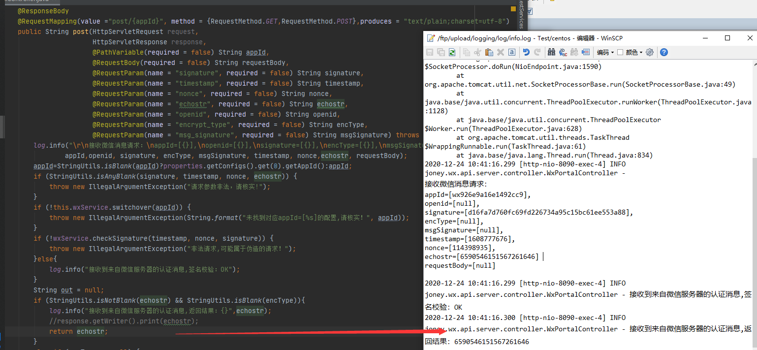 微信公众号服务器配置时一直提示 token验证失败,服务器的日志消息显示已经微信的get请求已经进入并成功返回了 “echostr”的值,但是依然显示token配置失败。