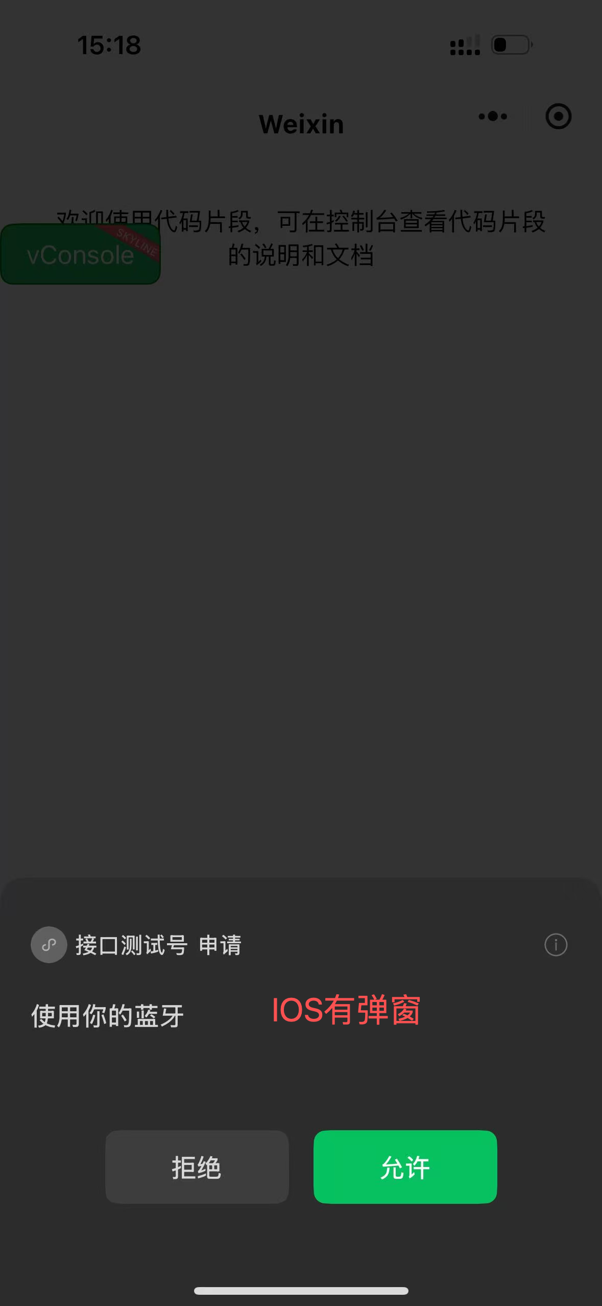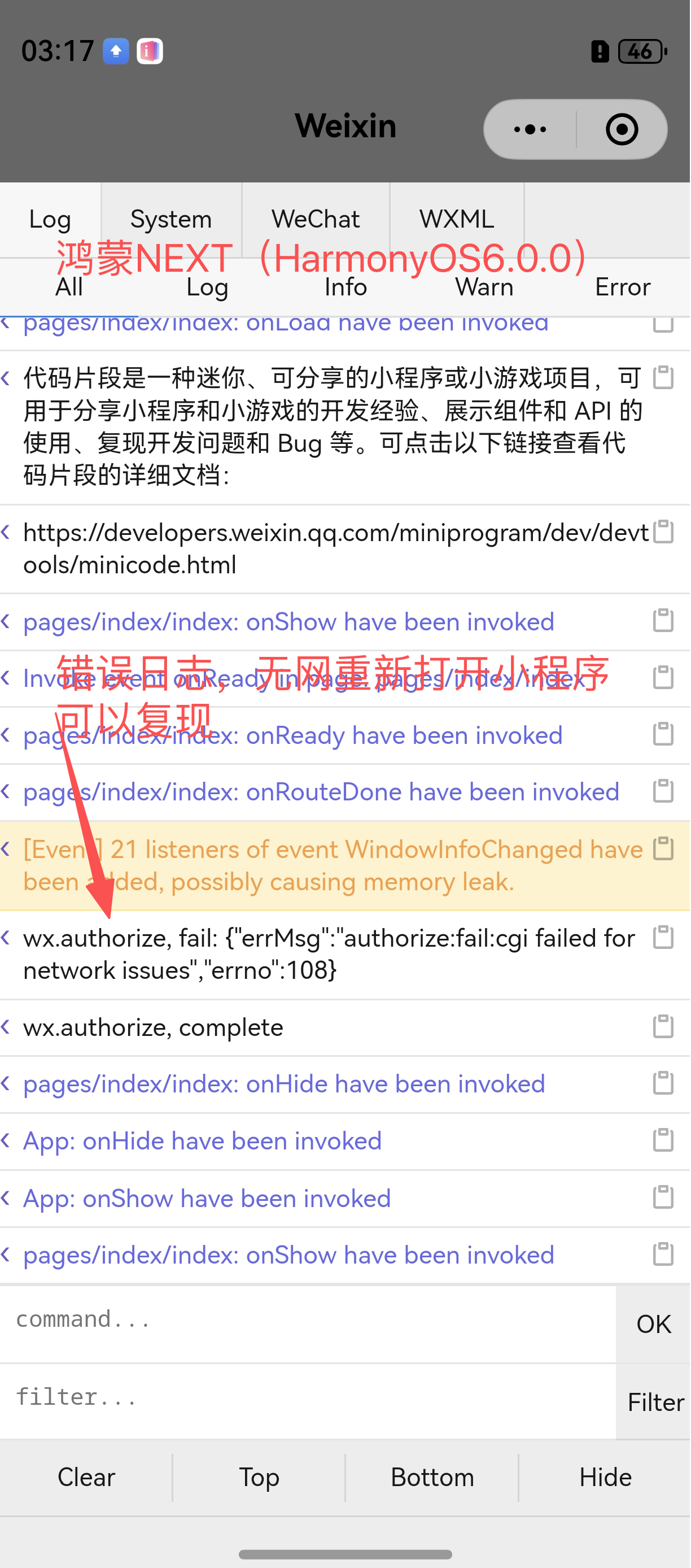 2. 运行代码片段,打开开发调试,手机关闭所有网络,重新进入小程序,IOS和安卓会出现授权窗,鸿蒙没有弹窗,随后日志中出现错误打印,并且后续调用BLE API也会出现错误