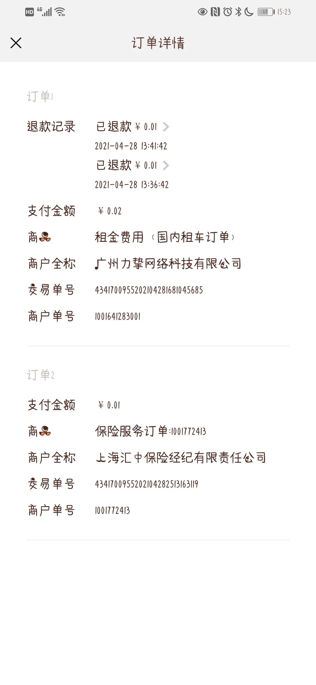 请求:url:https://api.mch.weixin.qq.com/v3/refund/domestic/refunds, params: {"transaction_id":"4341700955202104282513163119","reason":"用户取消订单","amount":{"total":1,"currency":"CNY","refund":1},"out_refund_no":"210428572698678454","notify_url":"https://paycenter-dev.zuzuche.com/notify/3152/async"}