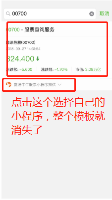 在用关键词测试的时候,搜索出来先显示的是别人的模板,点击选择服务提供方,选择自己的小程序体验版,就会导致这个模板消失。然后重新再搜关键词,体验小程序就不出现了