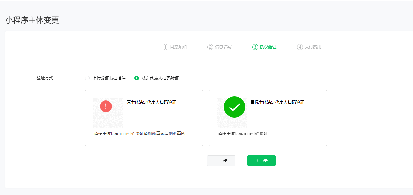原主体法人扫码一直失败,原主体最近转让了,原主体法人有变更,我在这个小程序主体变更流程中,如图的原主体法定代表人扫码验证一直不通过,已经让原主体的旧法人和新法人都操作过,都显示如图的‘企业法定代表人姓名不一致’,不知道是哪里的问题,希望能尽快解决,感谢!
