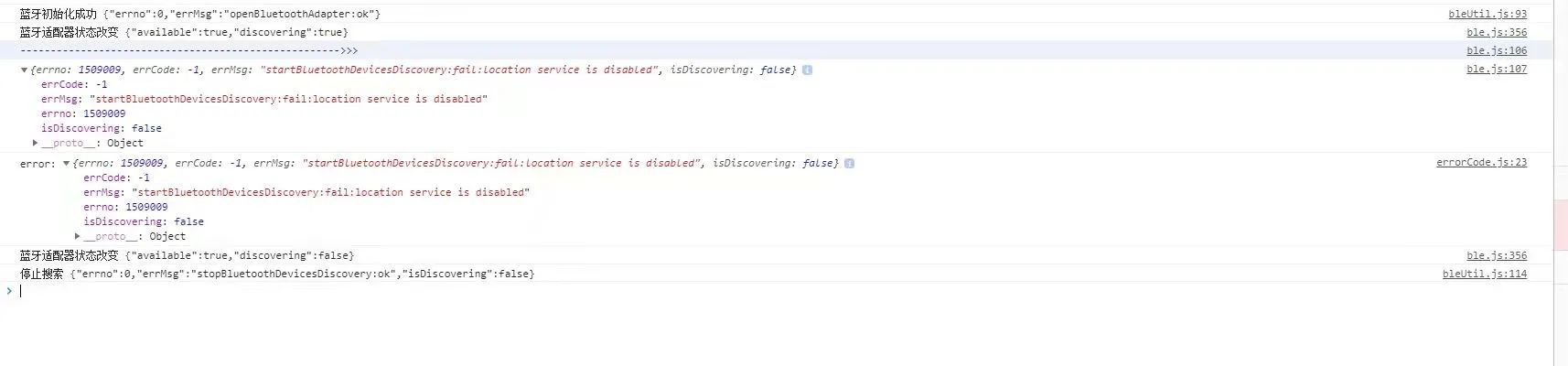 {"errno":1509009,"errCode":-1,"errMsg":"startBluetoothDevicesDiscovery:fail:location service is disabled","isDiscovering":false}