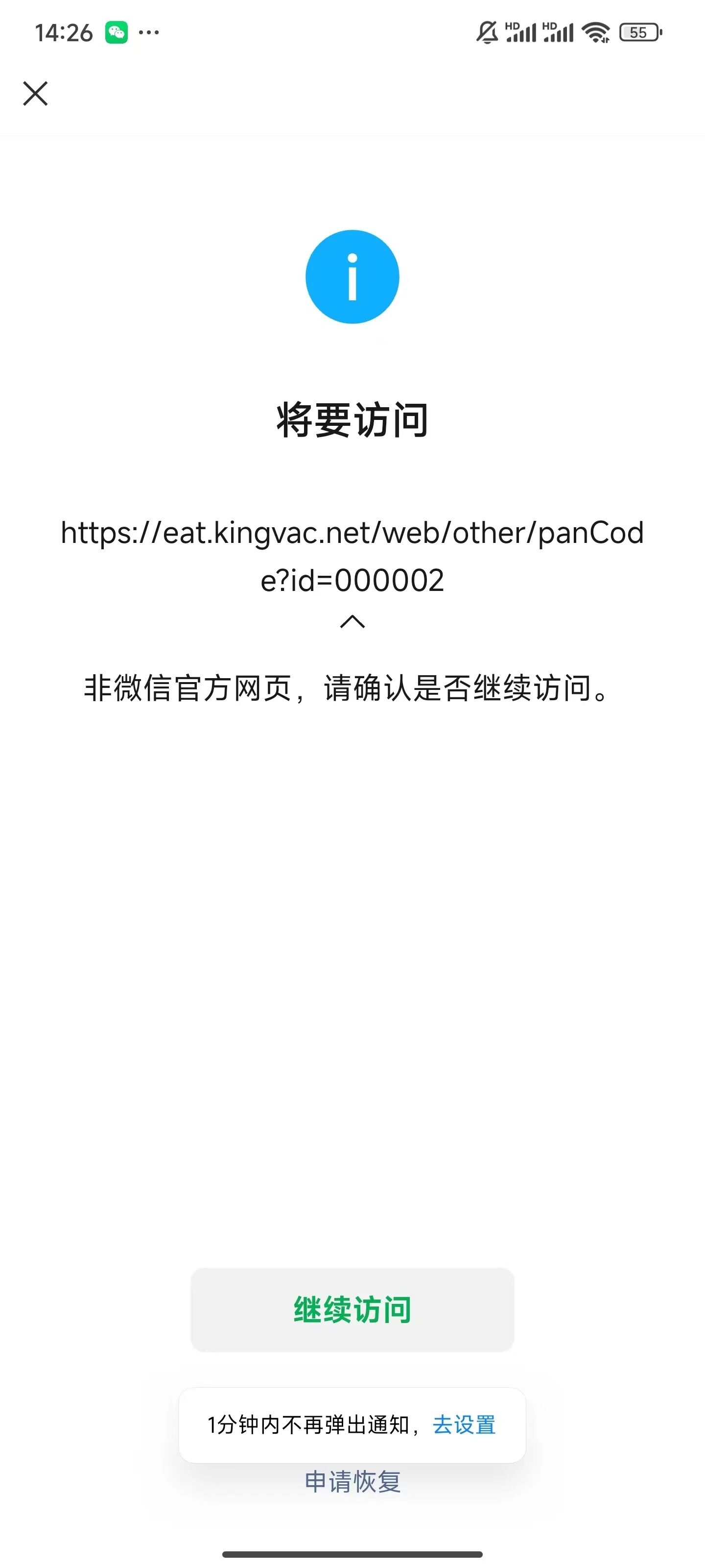 业务域名已经配置过了,备案也是通过的,通过小程序码进入就没问题,扫普通链接二维码打开就会这样子(配置的链接是:https://eat.kingvac.net/web/other/panCode?id=000001