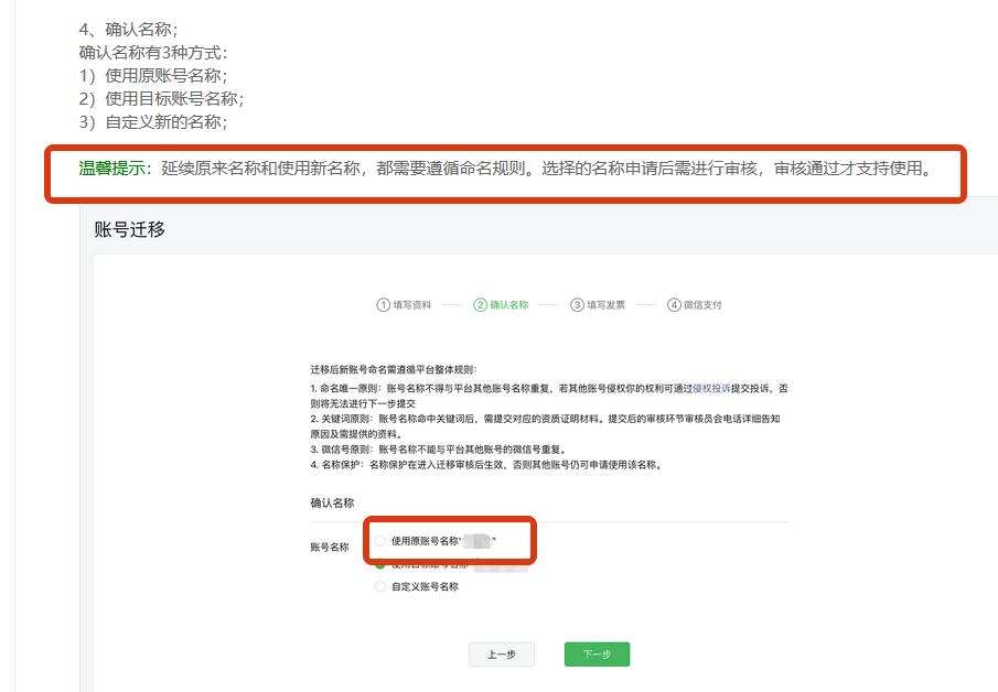 新账号随便取个名称,迁移过程中可以选择【使用原账号名称】,只要审核通过,新账号就是原账号名称了