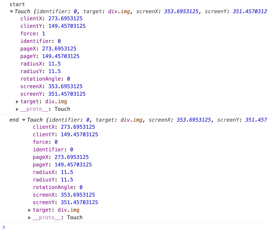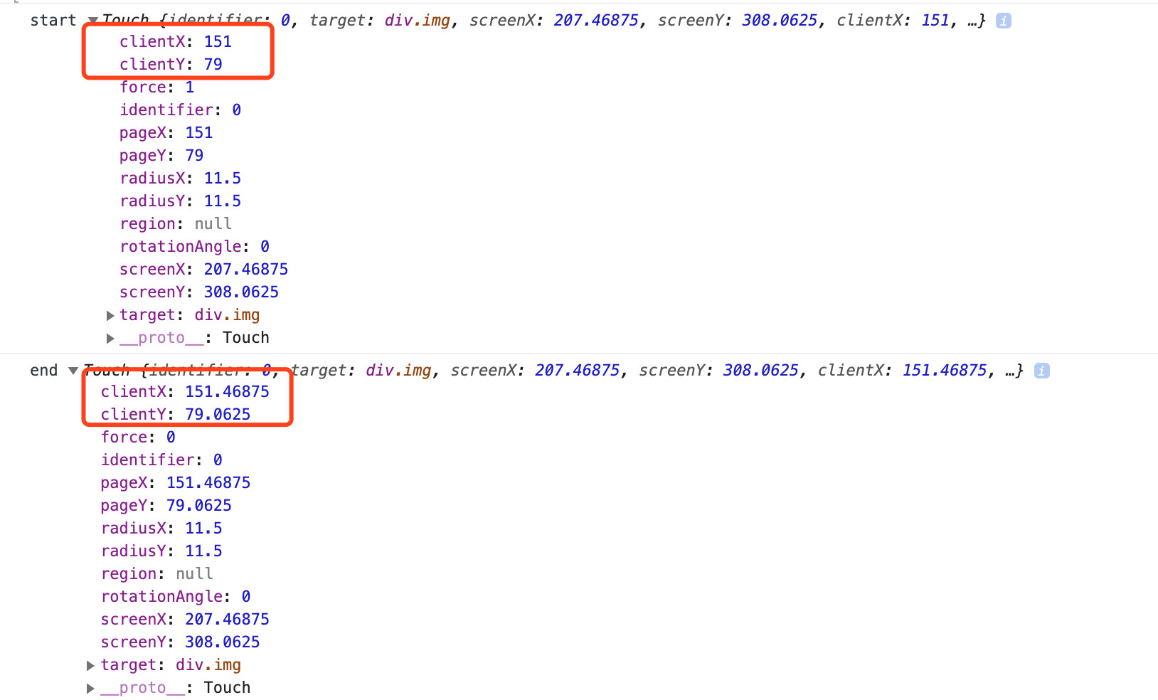 可以看到下图中,touchstart (clientX,clientY,pageX,pageY为整数),而 touchend 事件中变为了浮点数