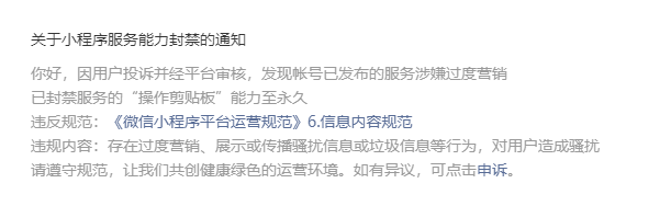 因为当时开发的时候没有意识到这个问题导致剪贴板能力被封禁,现在早已经整改上线好久了,希望能申请解封,拜托了。