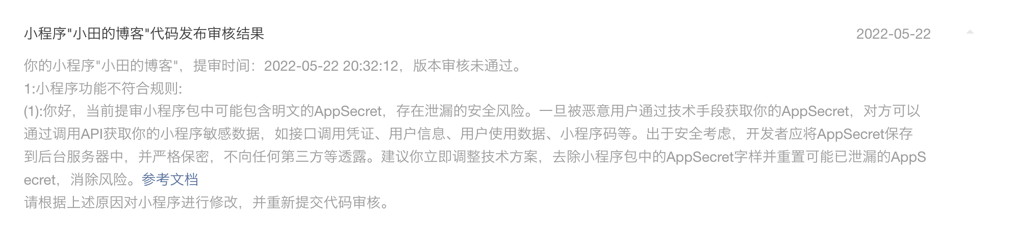 1.当前提审小程序包中可能包含明文的AppSecret,需排查并去除小程序包中的AppSecret字段及其对应值(包括但不限于当前小程序的AppSecret、appsecret、secert、key、app_key、server_key等)。