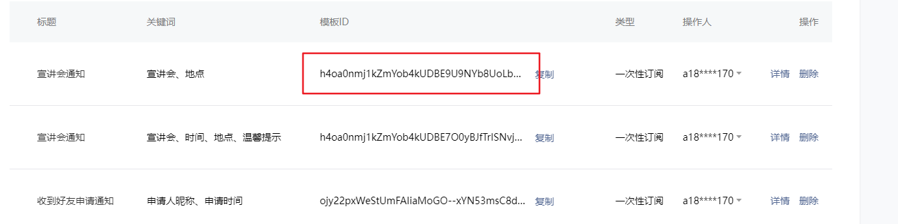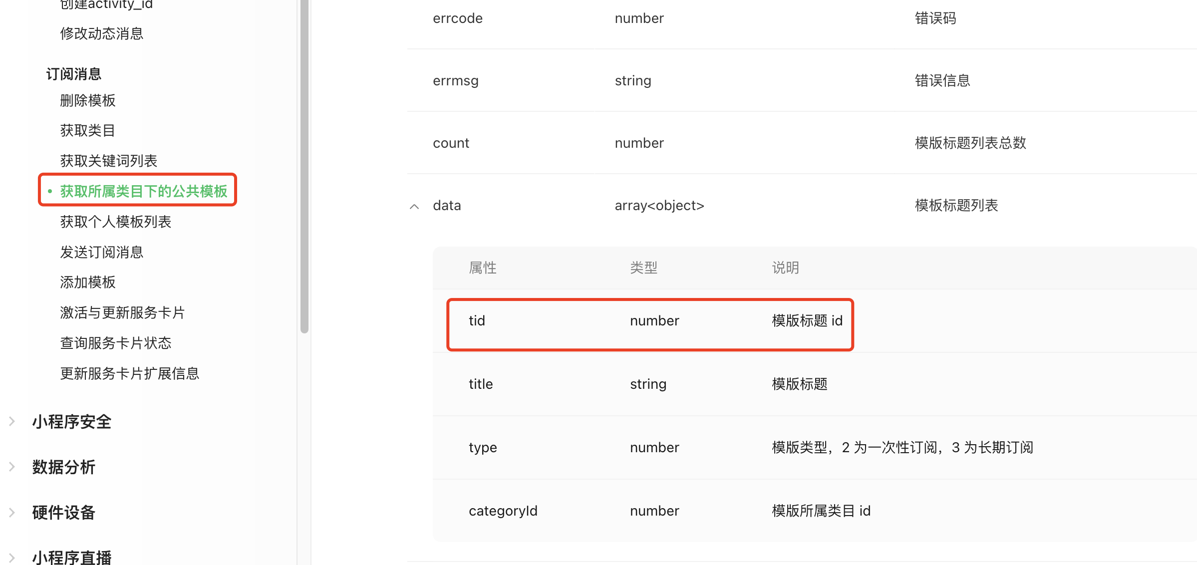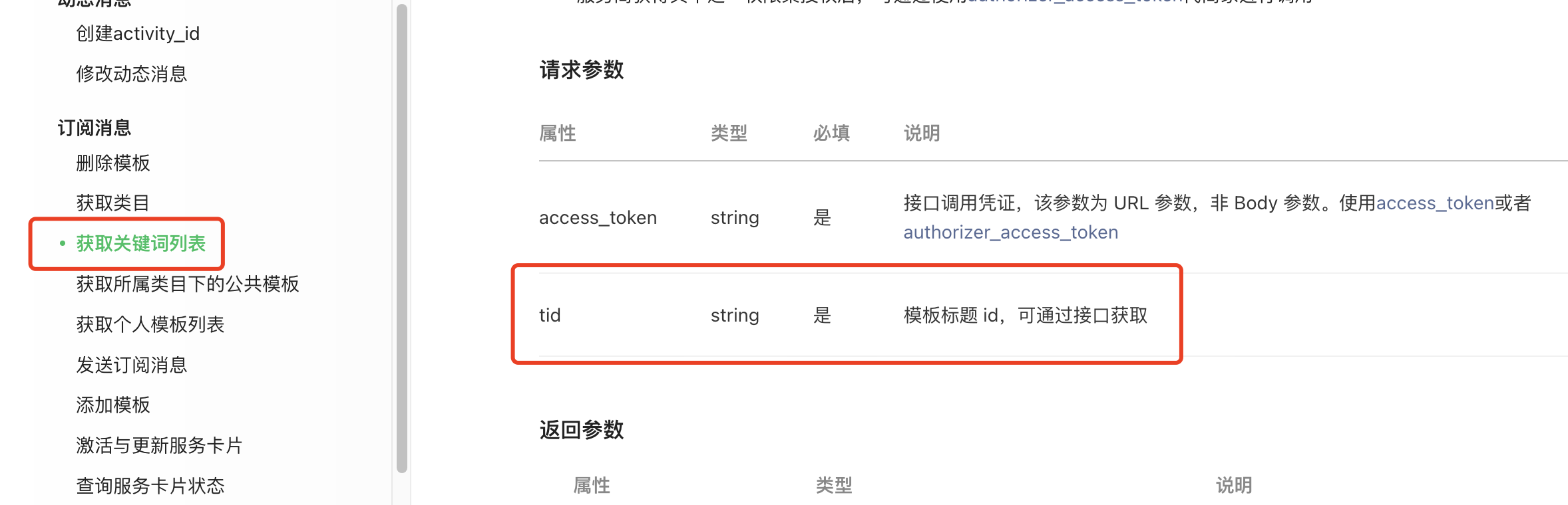 「获取关键词列表」接口是用来获取公共模板库下某一个模板标题的关键词列表,tid参数应该传的是公共模板库下的模板标题id(可通过「获取所属类目下的公共模板」接口获取),而不是传已经添加到账号下的模板ID。