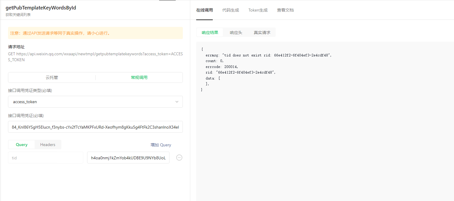 使用官方微信调试工具地址如下https://developers.weixin.qq.com/apiExplorer 获取到接口凭证填写tid 模板id 返回200014