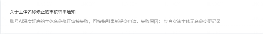 购买付费组件:手机号快速验证组件购买不了,提示“主体名称或证件号校验未通过,请前往更新”,然后我去更新,内容按照营业执照上填写,审核驳回:提示:“账号AI深度好房的主体名称修正审核失败,可按指引重新提交申请。失败原因: 经查实该主体无名称变更记录”,现在购买不了手机号验证组件,小程序无法正常登录使用,怎么处理?