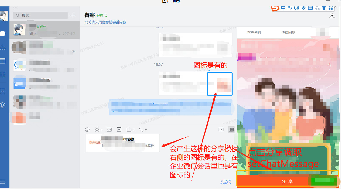 能够分享成功 在企业微信会话里 分享的图标是有的 但是 在微信里面看消息记录 分享的图片都没有 其他的自定义配置 title desc link 均ok 没任何问题,就仅仅图片有问题